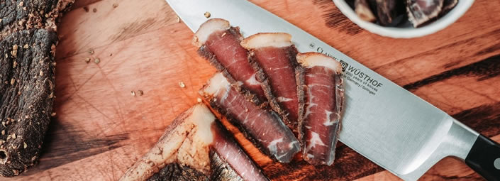 Oz Biltong use premium MSA Topside and marinated in a blend of premixed spices imported directly from South Africa. Vinegar, salt and our authentic spices are added prior to our unique curing process, not spiced after, unlike most who remanufacture. Consequently, we retain a lot more moisture in our Biltong product. The best way to retain the products, as purchased, is to place it in the freezer in an airtight container to prevent freezer burn. When you ready to eat it, simply take it out for a couple of minutes and it’s ready to be eaten.